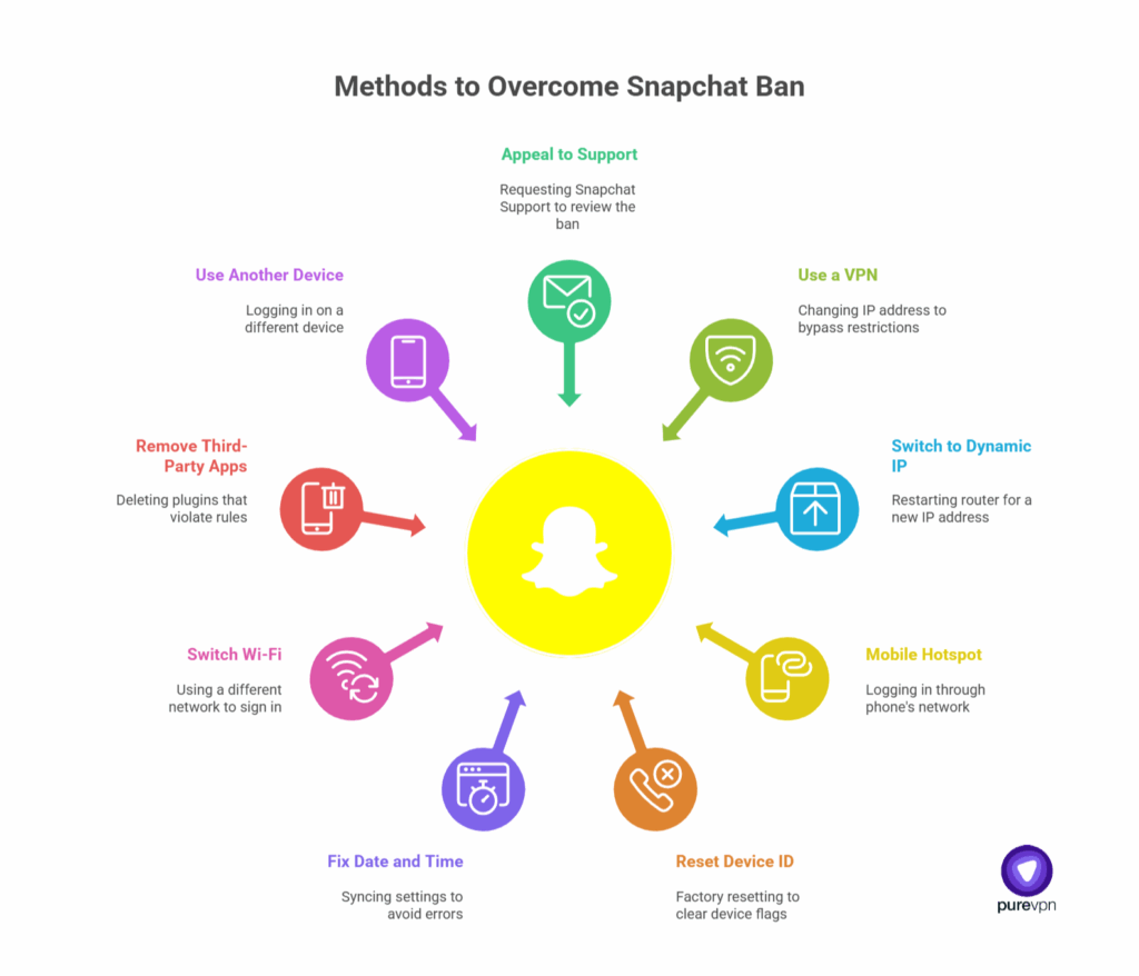 No. Sometimes, you might just get a temporary ban for a day. But if you really break the rules, your ban could be permanent. Snapchat might even block your IP address, making it impossible to use the app without using PureVPN. If you are temporarily banned, you can usually get back into your account by visiting Snapchat’s support site once the ban is over.