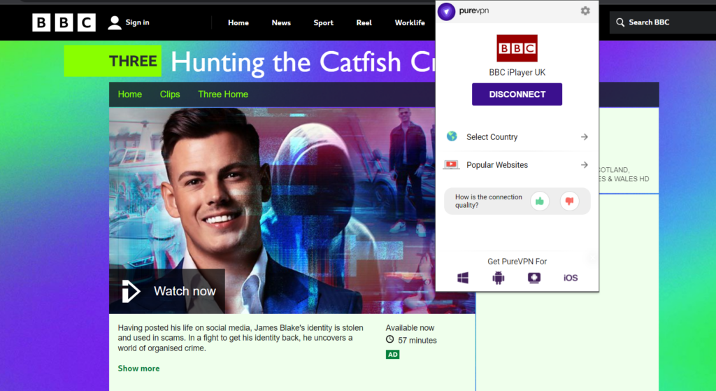 Hunting the Catfish Crime Gang is a BBC iPlayer show, so you can’t watch it directly in Australia. However, with the help of PureVPN, you can watch Hunting the Catfish Crime Gang in Australia on the platform without facing any geo-blocks.