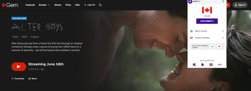 Since the show is coming up on CBC Gem, which only works in Canada, you will need a top-notch VPN service like PureVPN to circumvent all geo-blocks and access CBC Gem to watch Alter Boys in Australia hassle-free!