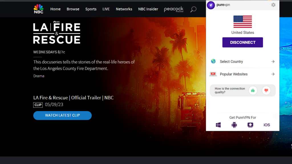 You can watch the show for free on the NBC channel. However, if you want to watch LA Fire & Rescue In Australia for free, you must use a VPN such as PureVPN to stream the series from anywhere.