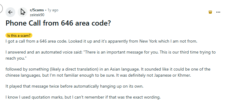 Many users in threads like r/Scams report sudden, random missed calls from 646 numbers, sometimes one ring, sometimes full call-backs, often with no message, or a suspicious voicemail prompting them to call back. Some describe garbled audio, pressure tactics, or weird silences.