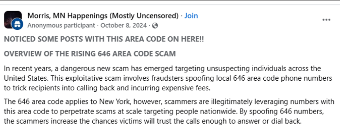 But like any area code that covers a major city, 646 numbers are frequently used, and spoofed by scammers. Because 646 is associated with Manhattan, many people perceive it as local, which makes them more likely to answer. Scammers exploit that familiarity.