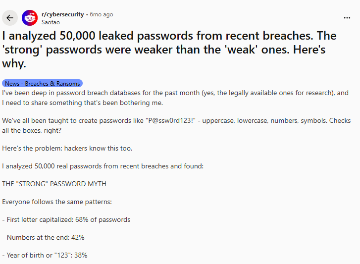 Reddit researchers also found that common complex format passwords often appear in breach datasets far more than genuinely unique strings, which highlights the problem with predictable complexity schemes.
