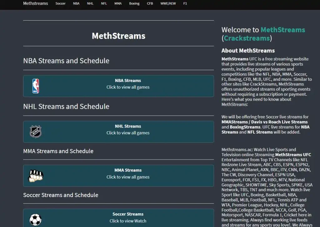 MethStreams stands out among Crackstream alternatives due to its stable mirrors and cleaner interface. It supports HD streams for football, basketball, MMA, and boxing with minimal redirects. Its categorized layout helps users jump directly to live or upcoming matches, making it a dependable choice during peak sports hours.