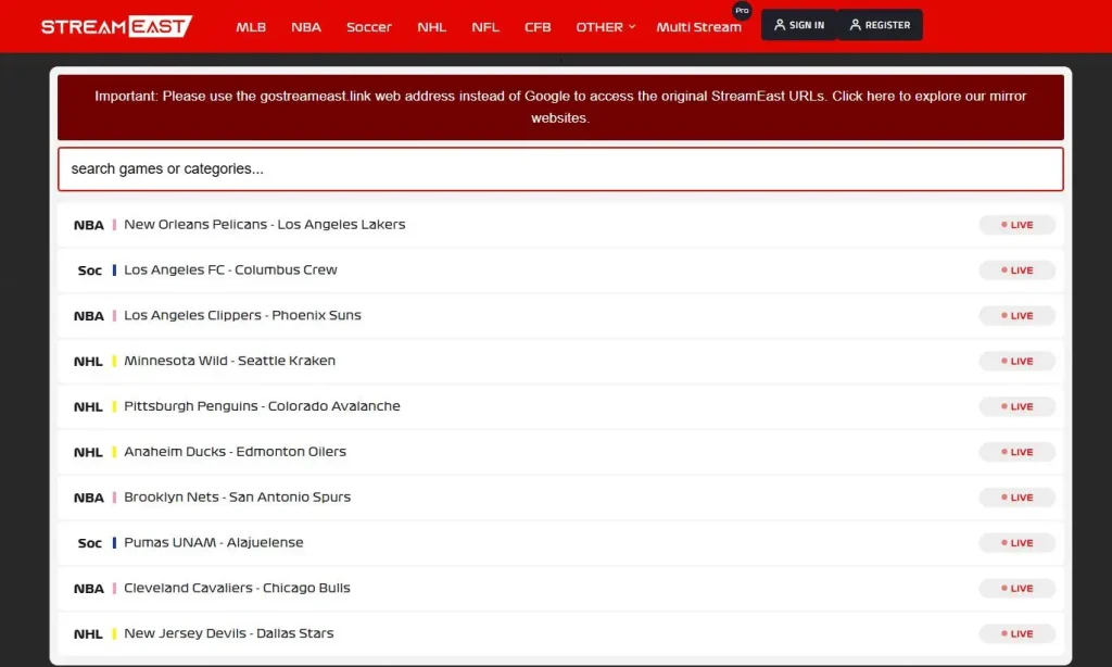 StreamEast is considered one of the most popular Crackstream alternatives because it offers high-quality streams with a smooth, modern layout. Users get multiple links per event, live score widgets, and quick access to major tournaments. Its fast-loading interface makes it easier to find active streams even during high-traffic moments.