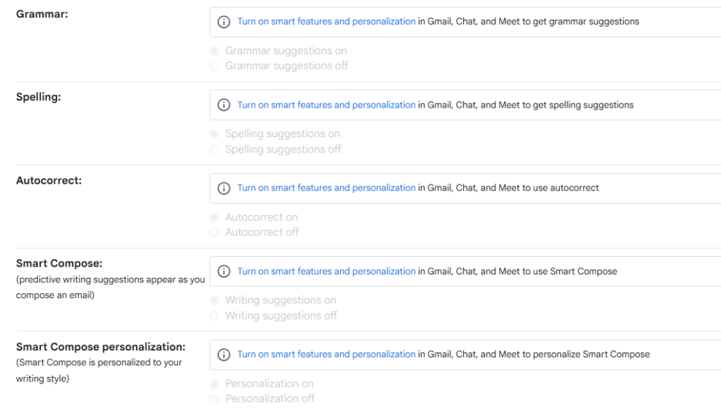 - Smart Reply and Smart Compose, so you won’t see suggested replies or predictive sentence completions.
