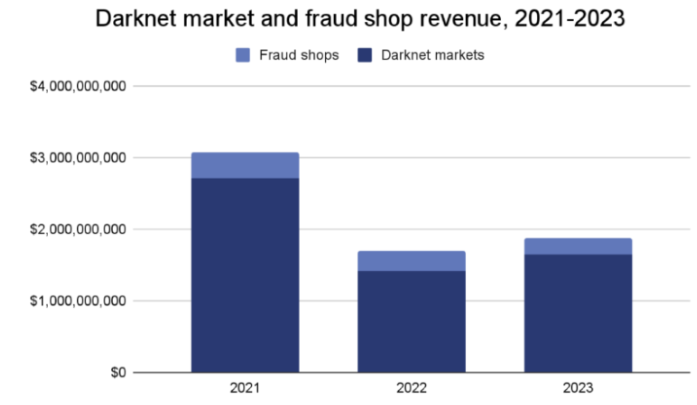 Chainalysis reported that darknet markets and fraud shops received $1.7 billion in 2023, an increase from 2022, showing that despite takedowns, markets remain lucrative. Higher revenue increases incentives for both more sophisticated escrow and scams.