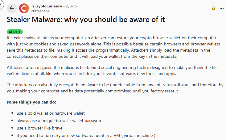 - Another shared how stealer malware harvested saved browser cookies and passwords, enabling a wallet to be restored on the attacker’s system.