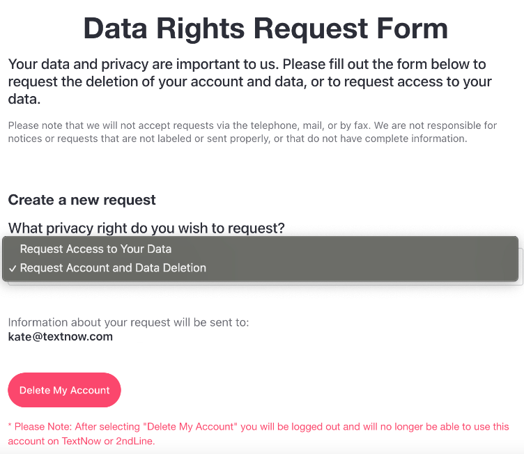 Here is how you can delete your TextNow account using the Data Rights Request Form page: