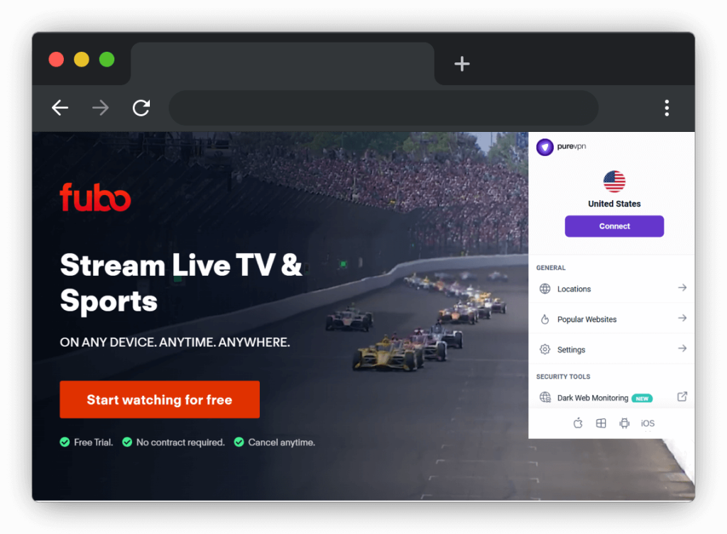 To bypass these regional limitations and watch the fight live, you need PureVPN. PureVPN masks your real IP address and assigns you a US IP address to access FuboTV. By connecting to the US server, you can trick Fubo TV into granting you access to watch the WBC Cruiserweight title fight from anywhere.