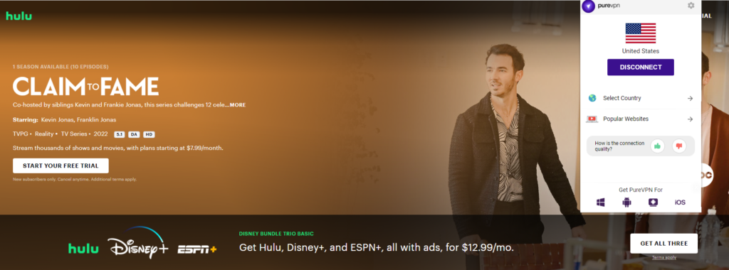 The most convenient way to watch Claim To Fame Season 2 outside the US is to get a US IP address using a premium VPN service like PureVPN and access Hulu’s content library from anywhere.