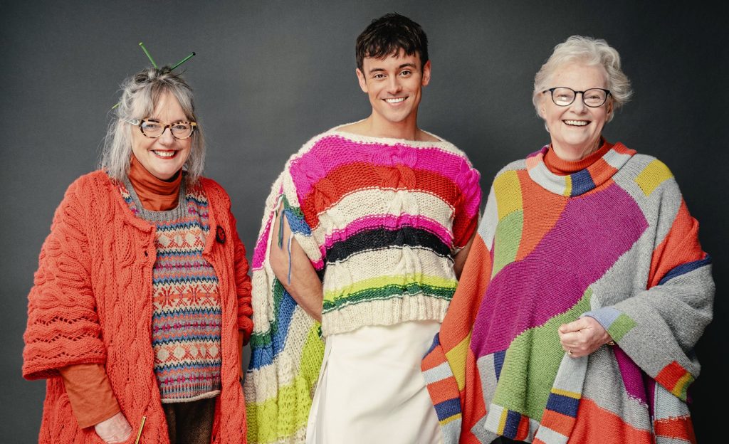 The cast of Game of Wool: Britain’s Best Knitter features Tom Daley as the host.