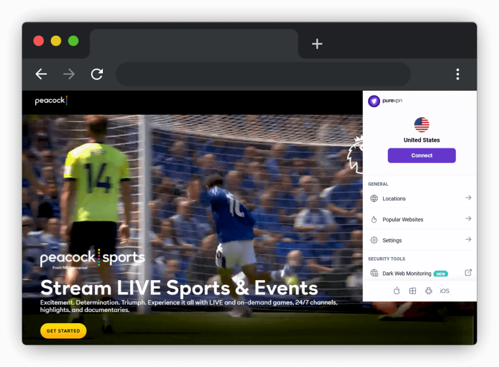 If you are traveling outside the US, open your PureVPN app and connect to a US server before opening the Peacock app to overcome regional barriers and enjoy the event.