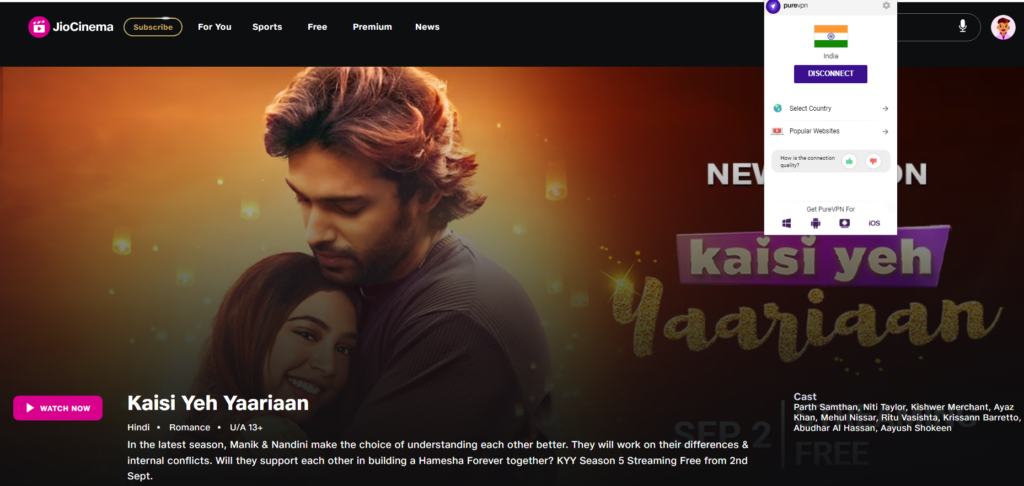 You can watch Kaisi Yeh Yaariaan Season 5 for free on Jio Cinema, as it’s totally free. However, if you’re in the US, it’s best to opt for a trusted VPN first, like PureVPN, to gain access to JioCinema.
