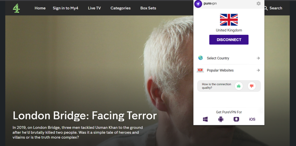 Tired of those pesky geo-blocks? Fret not! Enter PureVPN, your ultimate solution to online restrictions. With a simple click, you’re whisked away to a UK server, granting you full-on access to All 4’s stellar content library. Say goodbye to barriers and watch London Bridge: Facing Terror in the US; hello to hassle-free streaming!
