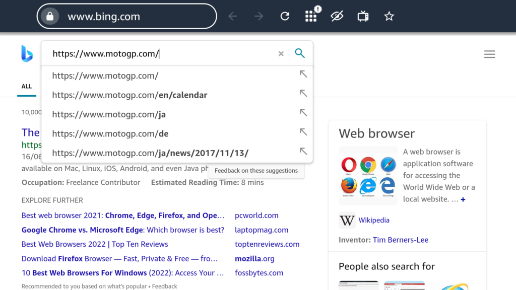 8. When the Bing.com tab appears, enter https://www.motogp.com/ in the address box.