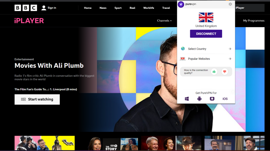 But, there is a way to get around the geo-restrictions and watch Movies With Ali Plumb in the US. You only need a reliable VPN like PureVPN to change your virtual location by altering the IP address to the UK. This will automatically originate your traffic from the UK, granting immediate access to BBC iPlayer, and letting you watch Movies With Ali Plumb in the US without a hitch!