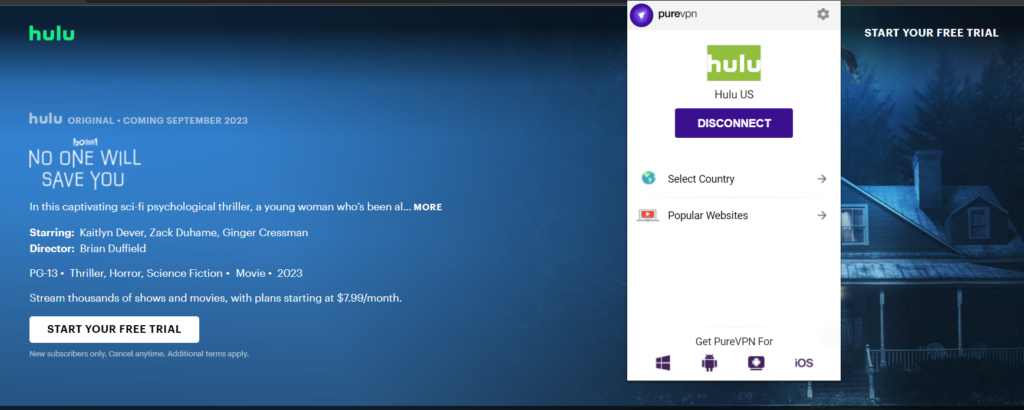 If you are a new subscriber to Hulu, you can use its free trial to watch No One Will Save You in the US without spending a dime. However, since Hulu does not work outside the US, you must use PureVPN to bypass geo-blocks and watch No One Will Save You outside the US for free.