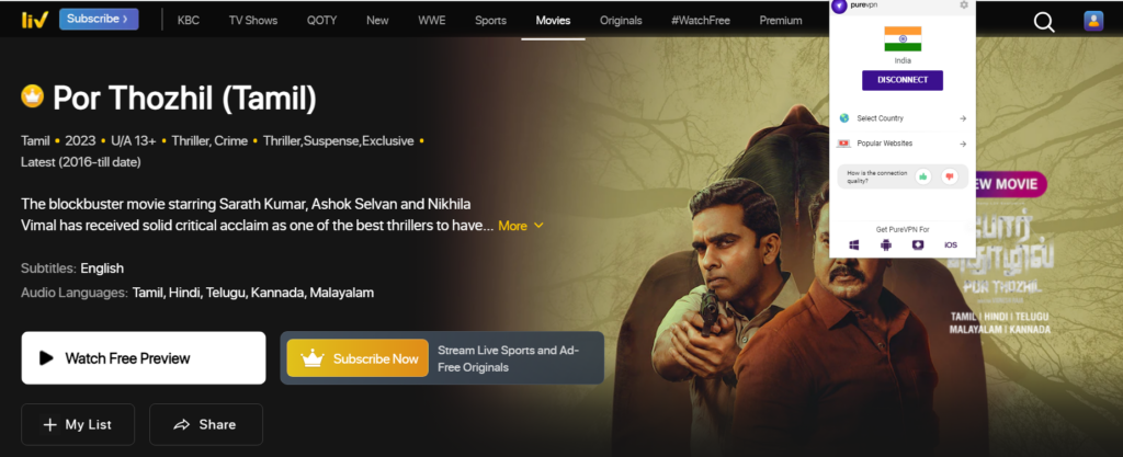 Sony LIV is an Indian streaming service that isn’t available outside of India due to content agreements. To enforce these agreements, geo-blocking technology prevents non-Indian viewers from accessing their content. Any solution? Yes, there is. By using PureVPN, you can connect to an Indian server and appear as someone in India rather than in the US. This way, Sony Live won’t prevent you from accessing its services and lets you watch Por Thozhil in the US.