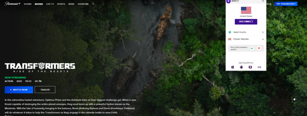 But, a workaround exists which will help you watch Transformers: Rise of the Beasts outside the US hassle-free. PureVPN is a premium quality and, above all, a safe VPN, which masks your original IP address to the US one and makes you appear as someone trying to access Paramount+ from within America.