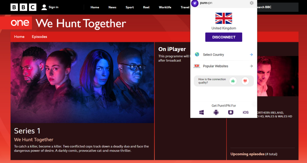 So, if you want to watch We Hunt Together in the US, all you need is a high-quality VPN service like PureVPN. It will change your IP address and make you appear to be from the UK, giving you full access to BBC iPlayer and allowing you to watch We Hunt Together in the US without any restrictions!