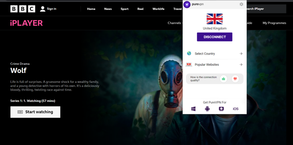 You can watch Wolf for free on BBC iPlayer. Although, if you’re outside the UK, you must use a VPN such as PureVPN to change your virtual location.