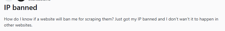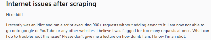 If your scraper sends too many requests per second or minute, servers slow down your access or temporarily block your IP. A Reddit user recalls running ~900+ requests too fast and then losing access.
