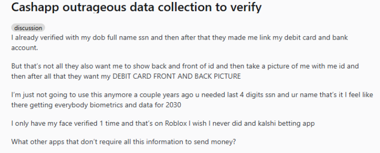“Cashapp outrageous data collection to verify … they want my DOB, full name, SSN … then my debit card front & back.” Reddit