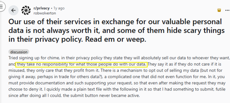 “Tried signing up for Chime, in their privacy policy they state they will absolutely sell our data to whoever they want, and they take no responsibility for what those people do with our data.”