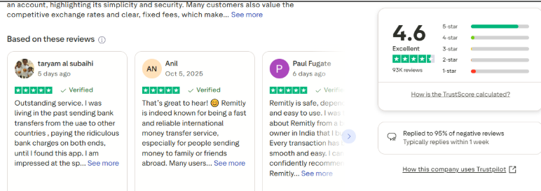 It operates under regulation in major markets and holds appropriate licensing. It uses strong encryption, fraud detection, verification, and safeguarding measures. User reviews are generally positive for Remitly, holding an average Trustpilot score of around 4.6 out of 5, with many users praising its safety and reliability.