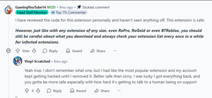 Even if RoGold itself is safe, there are still risks associated with browser extensions in general if you aren’t careful about permissions or downloads.