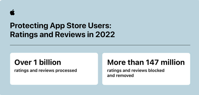 However, ratings and reviews from fraudulent or automated accounts can deceive users into downloading unreliable apps that attempt to manipulate the system through misrepresentation. In 2022, Apple took action by blocking and eliminating over 147 million ratings and reviews that did not meet the moderation standards out of the 1 billion ratings and reviews processed.