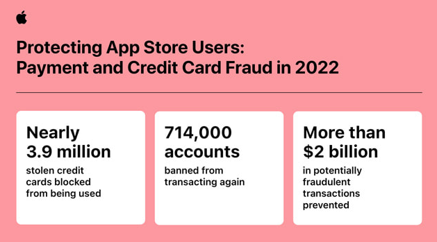 Apple’s App Store team prevented over $2 billion in transactions flagged as potentially fraudulent and blocked nearly 1.7 million app submissions due to privacy, security, and content policy violations in 2022.