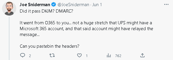 In response to Plummer’s posts, a Twitter user pointed out that the issue stemmed from the fact that the primary domain of UPS had an SPF record. Still, the scammer bypassed that protection by utilizing a related subdomain.