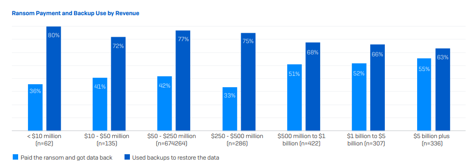 - Sophos reported that 45% of organizations utilizing backups could recover within a week, while only 39% of those who paid the ransom achieved the same result.