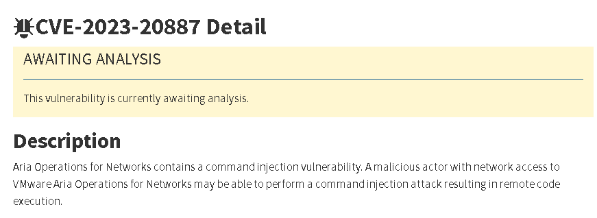 In its advisory, VMware highlighted three vulnerabilities of critical severity affecting the network and application monitoring tool. A command injection issue (CVE-2023-20887) with a CVSSv3 base score of 9.8/10 is of concern. This vulnerability enables a malicious actor with network access to VMware Aria Operations for Networks to carry out a command injection attack, leading to remote code execution.