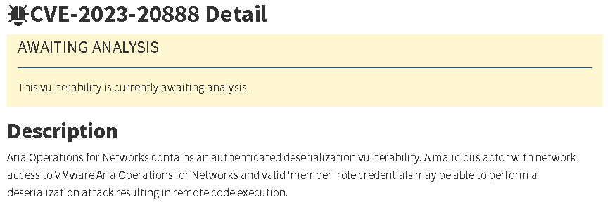VMware also addressed an authenticated deserialization vulnerability (CVE-2023-20888), which permits a malicious actor with network access and valid ‘member’ role credentials to execute a deserialization attack, ultimately resulting in remote code execution. This particular bug has a CVSSv3 base score of 9.1/10.