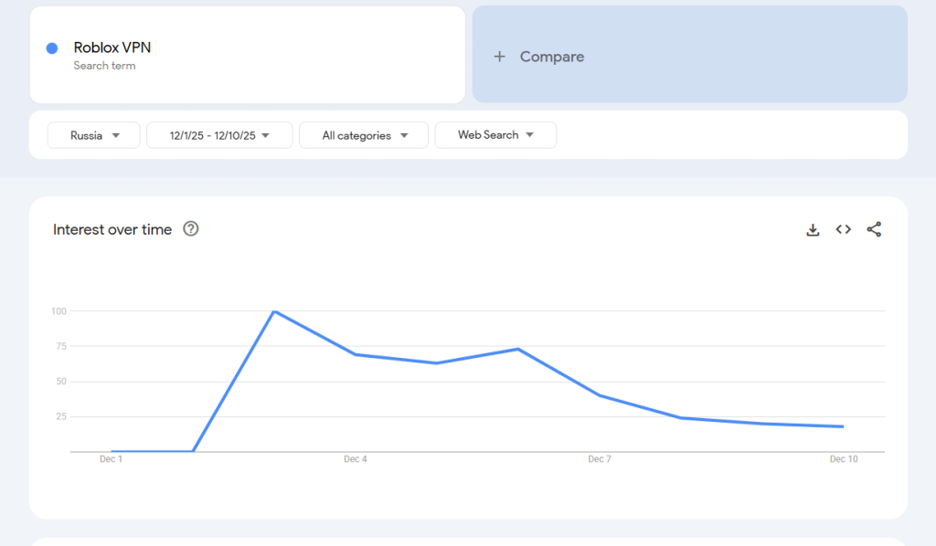 When access to a popular platform is restricted, users often look for information related to the block itself or circumvention tools. Search trends do not show whether tools like VPNs are actually used, but they do highlight a sharp increase in attention following the Roblox ban.