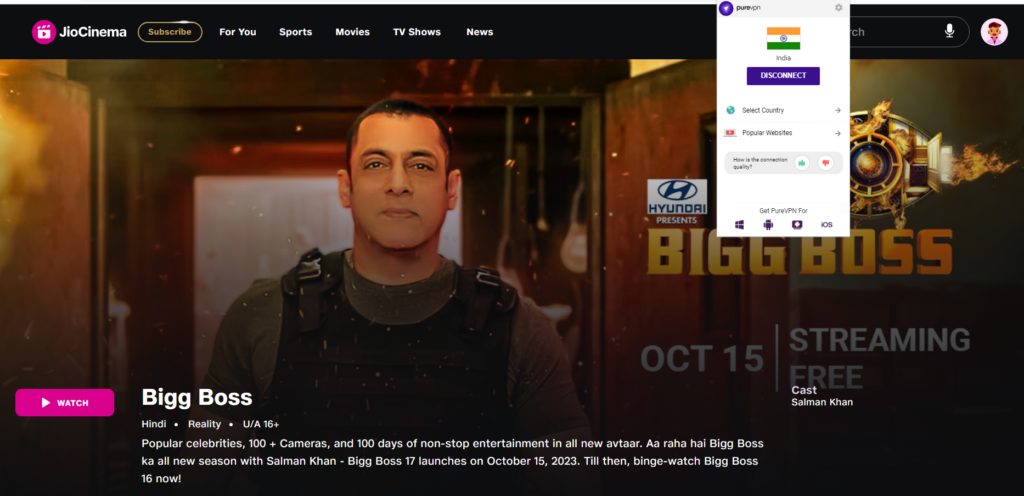 You can watch Bigg Boss Season 17 in India for free on Jio Cinema, as it’s free. However, to want to watch Bigg Boss Season 17 in Germany, you must use a reliable VPN like PureVPN to avoid geo-restrictions and access JioCinema like a local Indian.
