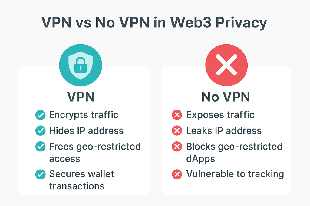 Even though Web3 is decentralized, your internet connection is not. A VPN hides your IP address, encrypts all traffic to blockchain nodes or dApps, and prevents ISPs or analytics trackers from profiling your activity. It adds the missing privacy layer that Web3 protocols alone can’t provide.