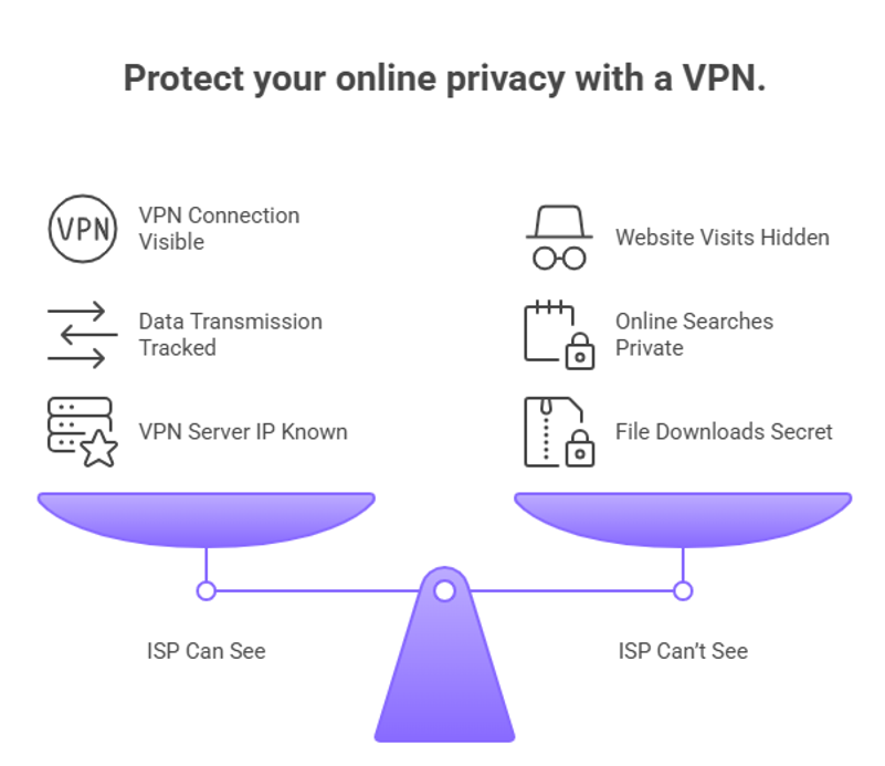 A VPN also plays a significant role in protecting your browsing history. It prevents ISPs from seeing which websites you visit by encrypting DNS requests, the background lookups that translate website names into IP addresses. With a VPN, these DNS requests are handled privately through the VPN’s own DNS servers rather than your ISP’s, reducing the chances of tracking or data collection.