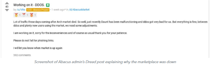 In mid-2025, Abacus Market (a major Bitcoin-enabled Western DNM) went offline and TRM Labs publicly assessed the event as a likely exit scam, although a covert law-enforcement seizure remained a possibility. Analysts noted that consolidation in the market plus operator instability, have coincided with higher exit risks.