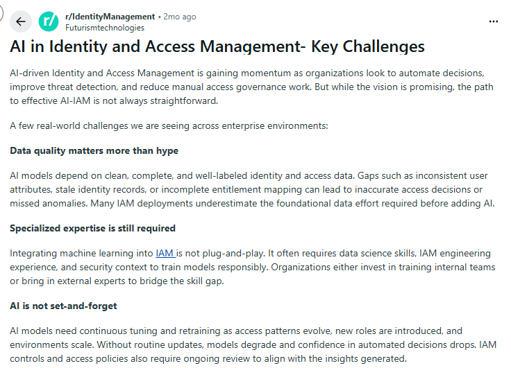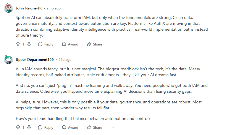 Reddit discussions show a consistent reality check, though: AI is only as good as the data behind it. If identity data is messy or outdated, AI can make the wrong calls. That’s why clean data and strong governance are non-negotiable before trusting AI with access decisions.