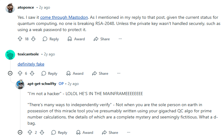 Discussions among cybersecurity communities on Reddit reflect this reality, where scholars point out claims of RSA being broken are either about small toy keys or speculative future threats, and stress that RSA-2048 remains safe for now.