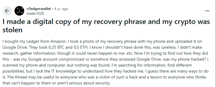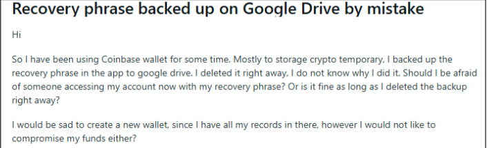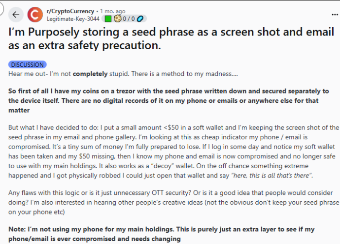 Cloud storage like Google Drive, iCloud, or Dropbox might seem convenient, but plenty of Reddit users warn how risky it is; breaches, leaks, or even mistaken backups can expose your recovery phrase. In fact, MetaMask explicitly tells its users not to store their Secret Recovery Phrase (SRP) online.
