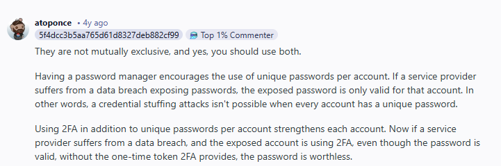 In multiple cybersecurity discussions, the dominant recommendation is clear, layered protection works best. Many users point out that 2FA protects the login event, while password managers protect the overall credential ecosystem, which reflects the broader security industry consensus.