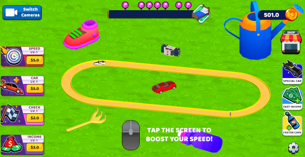 An idle clicker game where you build a fleet of cars and watch them race on dynamic tracks. You upgrade your vehicles, optimize your track layout, and reinvest earnings to scale your racing empire. The game balances idling strategy with active decision-making.
