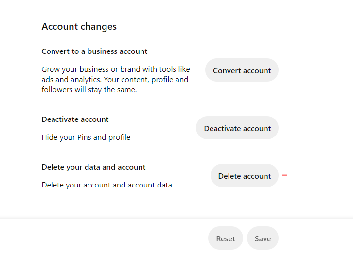 - Business account: If you delete your Pinterest account, note that associated business accounts will also get deleted, so unlink those first.