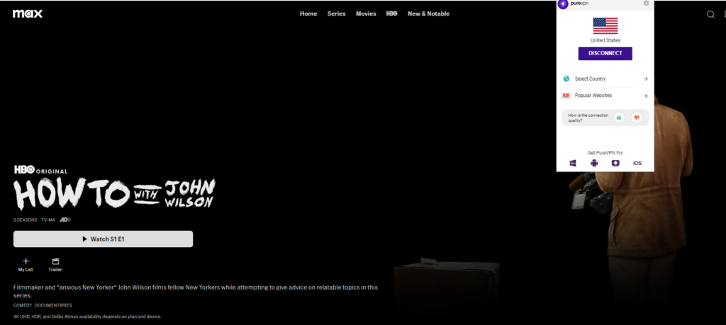 If you’re stuck with an error message, PureVPN is the best option to get past these geo-restrictions. With one click, you can connect to the US server and appear as a US citizen on HBO Max’s servers, thus gaining access to the vast HBO Max content library to watch How To with John Wilson Season 3 in Canada.