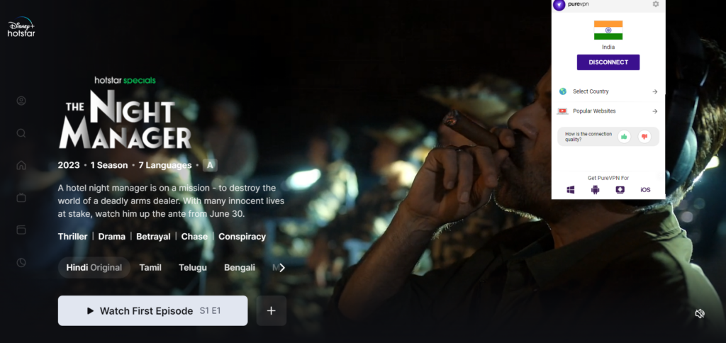 Unfortunately, Disney+ Hotstar only works in India and is blocked in other countries such as the US. If you want to watch The Night Manager Season 2 in Canada, you will need a high-quality VPN like PureVPN to unblock Disney+ Hotstar. Find out more in our guide below: